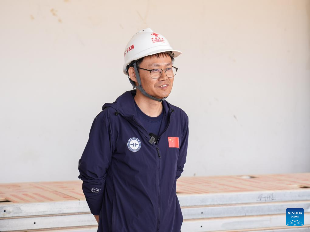 Xu Jiangbo, technical lead of the physical infrastructure project on site, receives an interview with Xinhua at the construction site of a museum at the Ngorongoro Lengai UNESCO (United Nations Educational, Scientific and Cultural Organization) Global Geopark in Arusha region, Tanzania, on April 26, 2025. (Xinhua/Li Yahui)