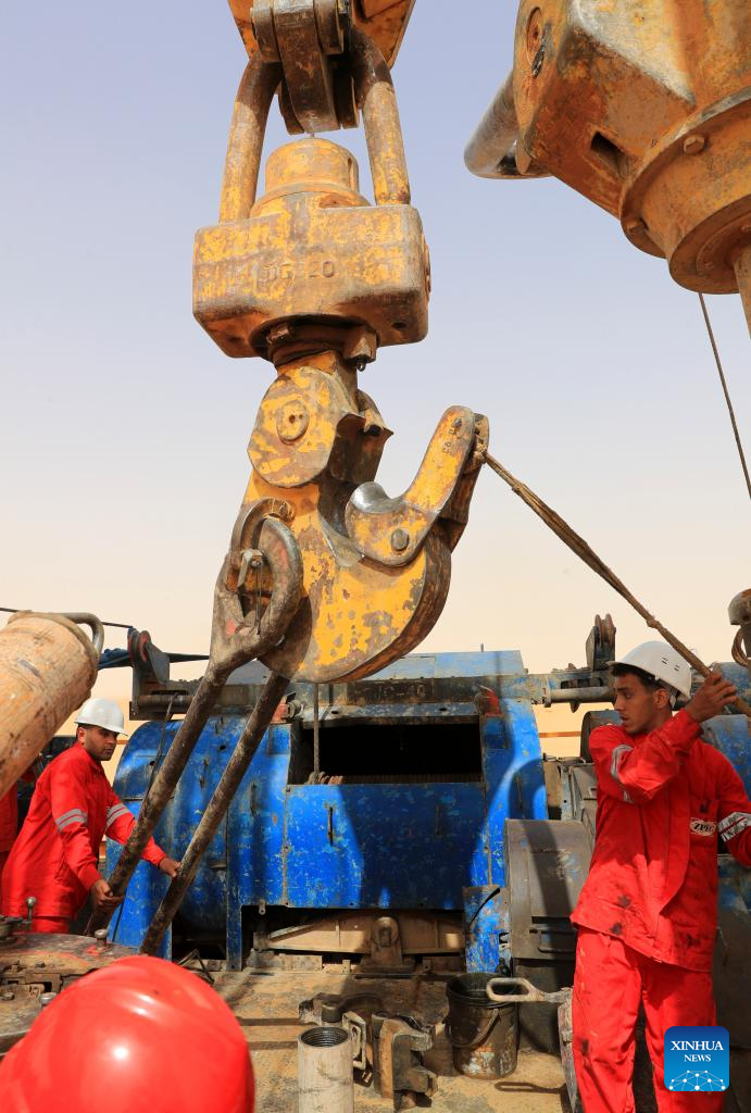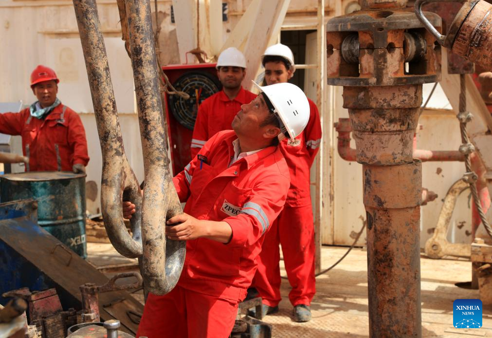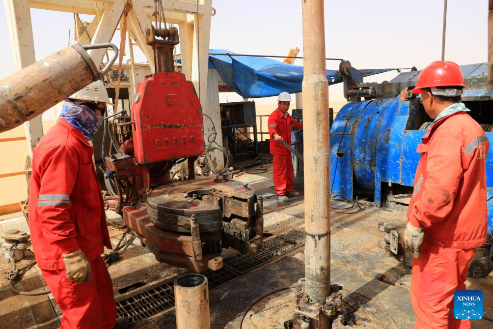 Workers operate on a well-drilling rig at the site of Owainat Water Well Project in the desert of New Valley Governorate, Egypt, on May 3, 2025. (Xinhua/Sui Xiankai)