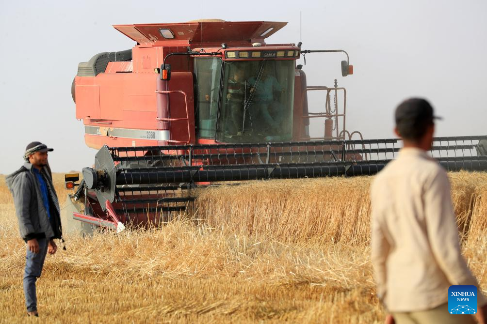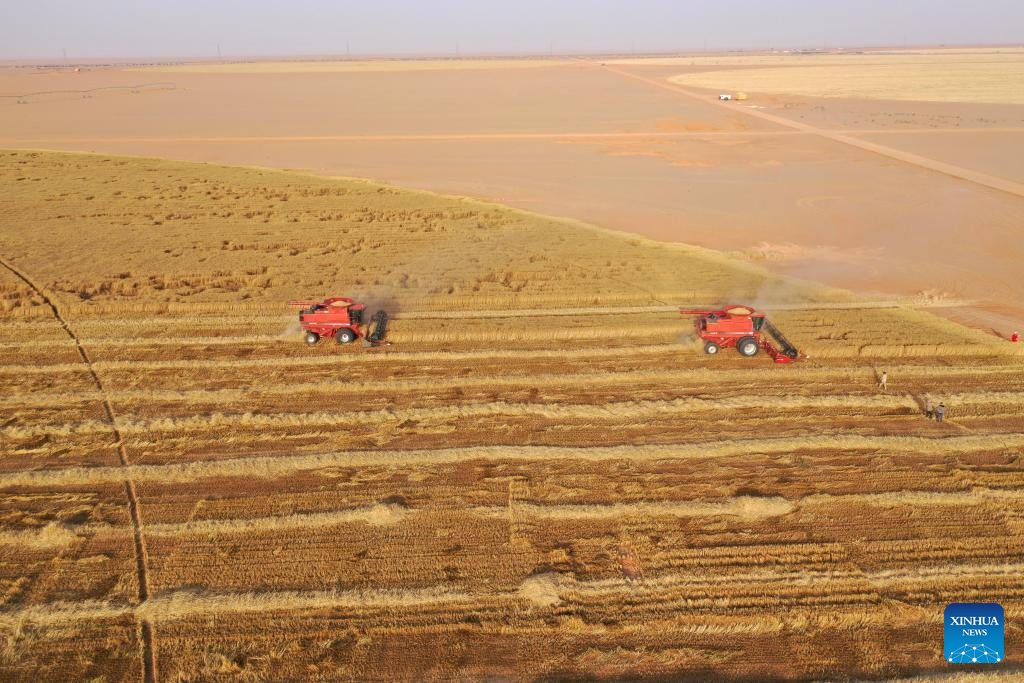 A harvester reaps wheat at a farm in the desert of New Valley Governorate, Egypt, on May 3, 2025. (Xinhua/Sui Xiankai)