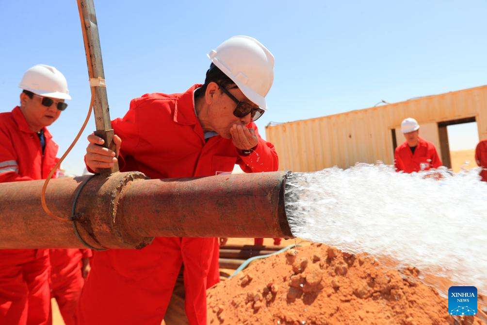 Li Chundi, chairman of ZPEC, tastes groundwater from a water well drilled by the ZPEC branch in Egypt in the desert of New Valley Governorate, Egypt, on May 3, 2025. (Xinhua/Sui Xiankai)