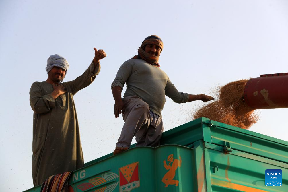 Egyptians gesture while working on newly-harvested wheat at a farm in the desert of New Valley Governorate, Egypt, on May 3, 2025. (Xinhua/Sui Xiankai)