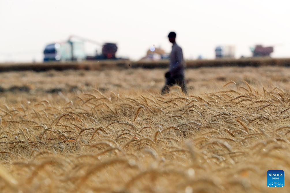 This photo taken on May 3, 2025 shows ripe wheat to be harvested at a farm in the desert of New Valley Governorate, Egypt. (Xinhua/Sui Xiankai)