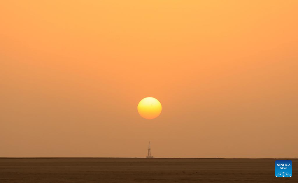 This photo taken on May 3, 2025 shows a well-drilling rig at sunset at the site of Owainat Water Well Project in the desert of New Valley Governorate, Egypt. (Xinhua/Sui Xiankai)