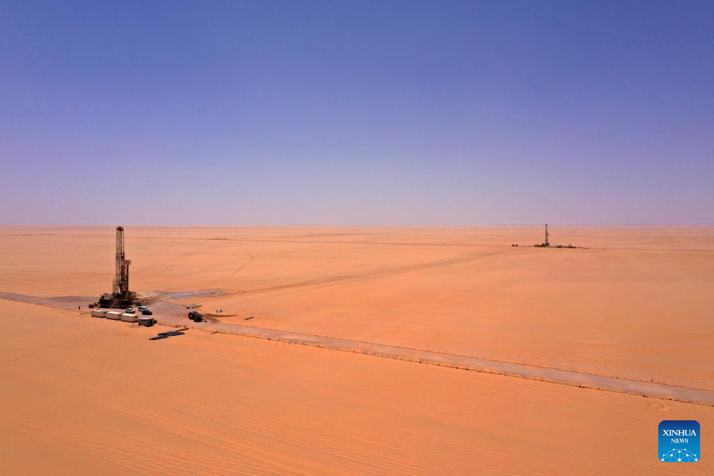 This photo taken on May 3, 2025 shows a well-drilling rig at the site of Owainat Water Well Project in the desert of New Valley Governorate, Egypt. (Xinhua/Sui Xiankai)