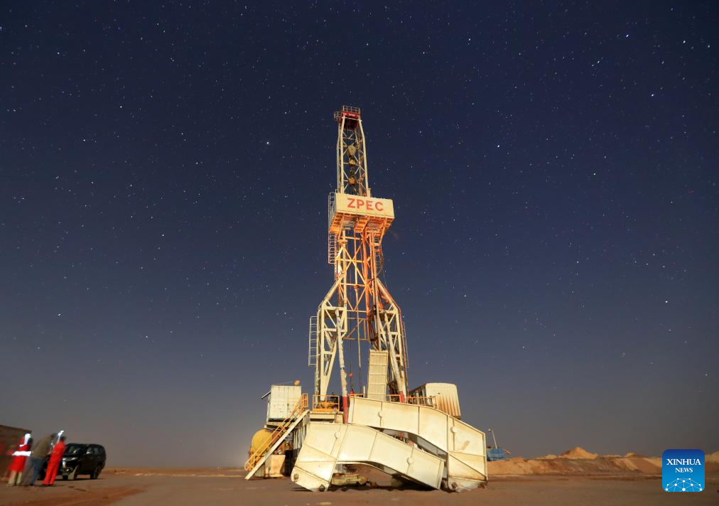 This photo taken on May 3, 2025 shows a well-drilling rig at night at the site of Owainat Water Well Project in the desert of New Valley Governorate, Egypt. (Xinhua/Sui Xiankai)