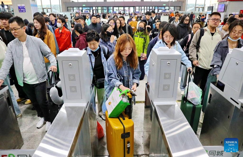Passengers disembark at Jinhua Railway Station in Jinhua, east China's Zhejiang Province, May 5, 2025. On the last day of the May Day holiday, a peak in return trips was observed nationwide. (Photo by Hu Xiaofei/Xinhua)