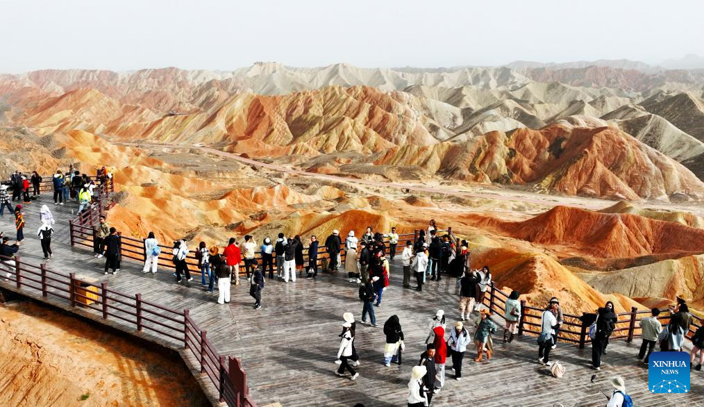 Tourists visit the Danxia National Geological Park in Zhangye, northwest China's Gansu Province, May 4, 2025. During the five-day May Day holiday, Chinese travelers took an estimated 314 million domestic trips, marking a 6.4 percent increase from the previous year, according to figures released by the Ministry of Culture and Tourism.