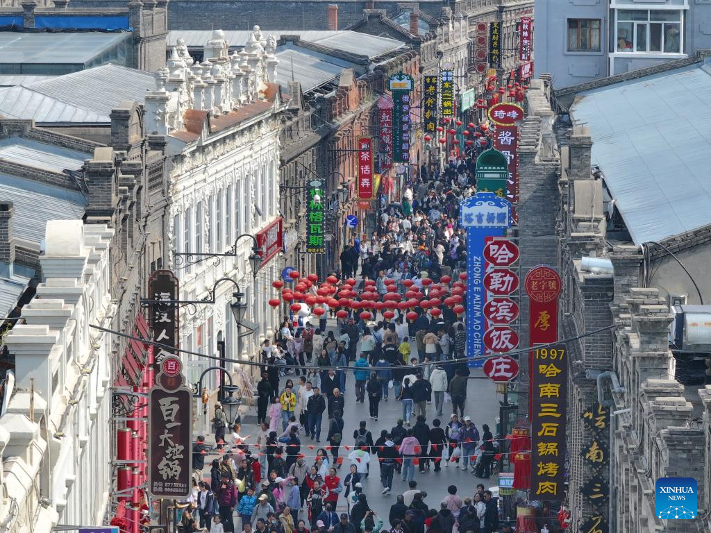 An aerial drone photo shows tourists visiting a historical and cultural block in Harbin, northeast China's Heilongjiang Province, May 1, 2025.