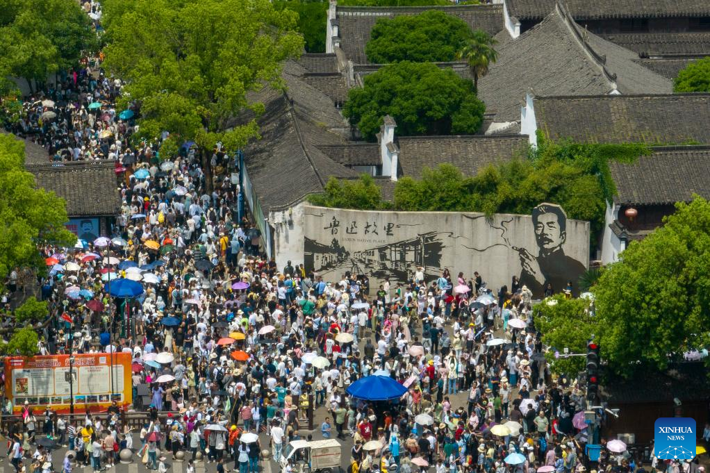 An aerial drone photo taken on May 3, 2025 shows tourists visiting Shaoxing known for being the hometown of Lu Xun, east China's Zhejiang Province.