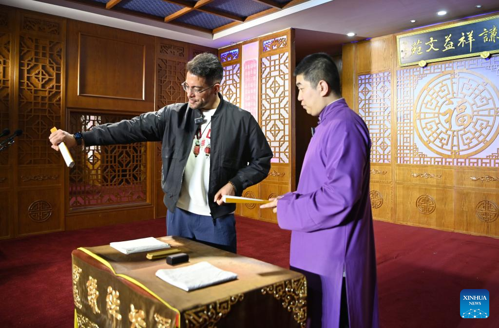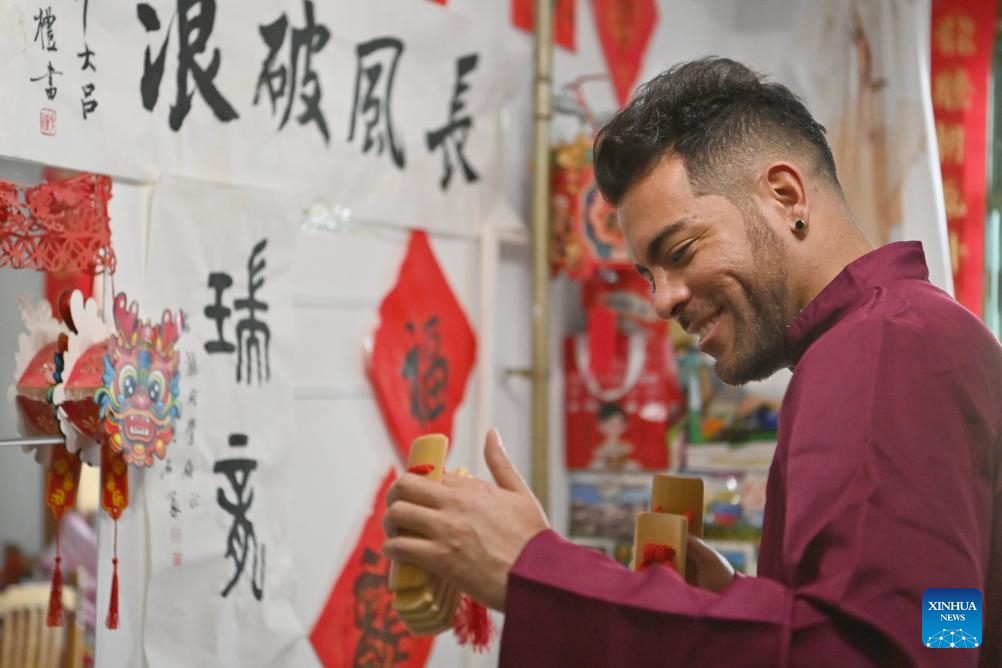 Raydis Franco practices kuaiban, a form of Chinese storytelling accompanied by bamboo clappers, at his home in north China's Tianjin, April 25, 2025. Spanish teacher Raydis Franco from Venezuela works at the School of Foreign Studies in Nankai University in Tianjin. He came to China on a cultural exchange program and started his seven-year study at Tianjin University in 2015. The past decade has turned this 36-year-old man a fluent speaker of Chinese.