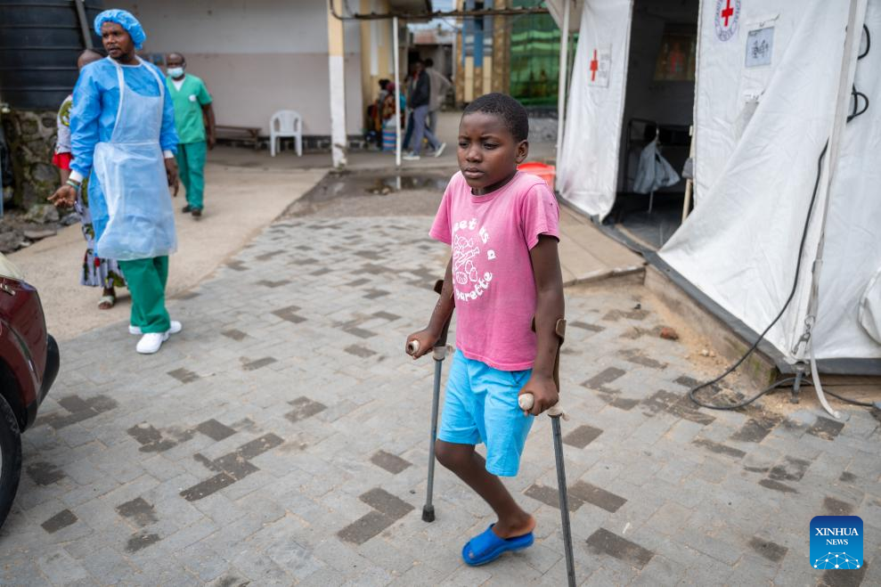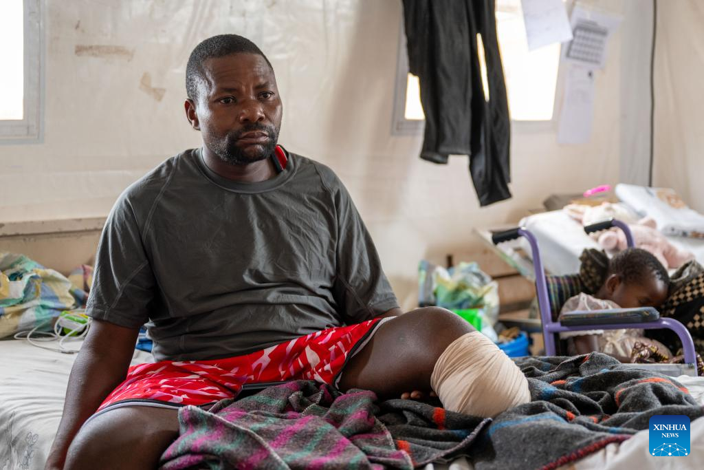 A child who lost the left leg in the local conflict is seen at Ndosho Hospital in Goma, the Democratic Republic of the Congo (DRC), on May 10, 2025. Ndosho Hospital, located in Goma, the capital city of North Kivu province in the eastern DRC, has built temporary tents in its parking lot to relieve pressure and increased its bed capacity to approximately 130, as the security situation in the eastern DRC has deteriorated in recent years. (Xinhua/Zheng Yangzi)