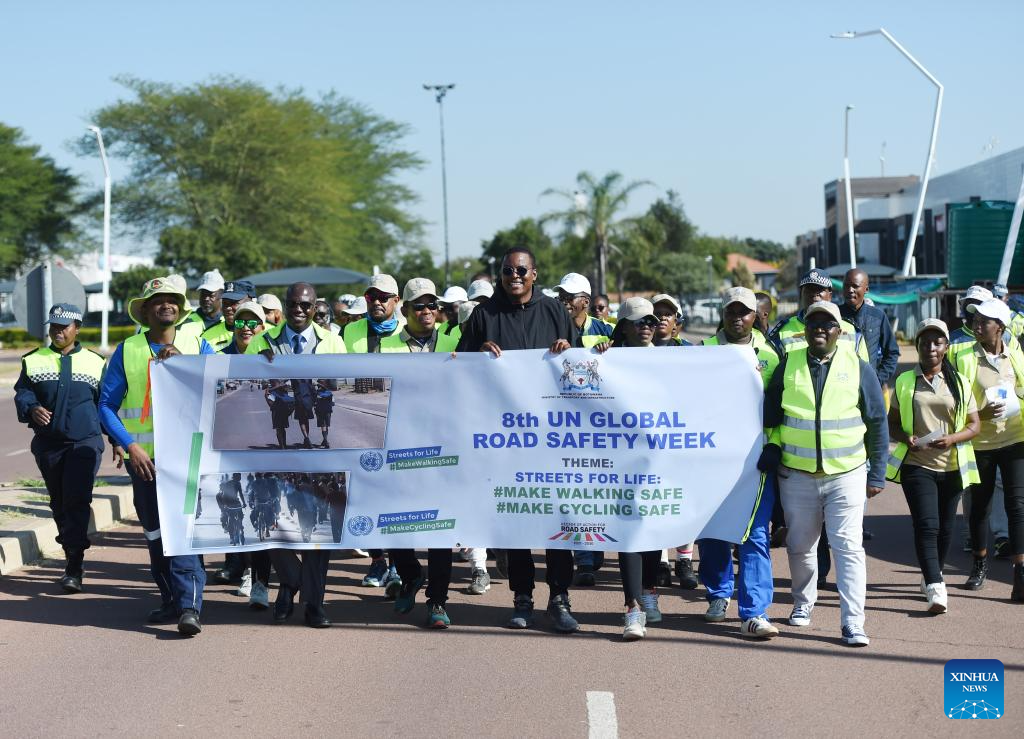 A march is held for the 8th United Nations Global Road Safety Week in Gaborone, Botswana, on May 12, 2025. The 8th UN Global Road Safety Week is held from May 12 to May 18, under the theme "Make Walking and Cycling Safe." (Photo by Tshekiso Tebalo/Xinhua)