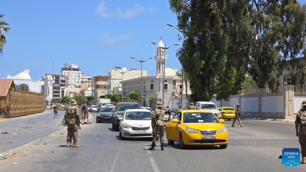 The security personnel of the Libyan government maintain order on a street in Tripoli, Libya on May 13, 2025. (Photo by Hamza Turkia/Xinhua)