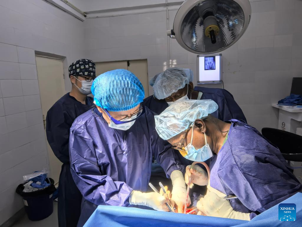 Diao Naicheng, an orthopedic expert from the Chinese medical team, performs surgery on a patient at Sino-Guinean Friendship Hospital in Conakry, Guinea, May 13, 2025. (The 31st Chinese medical team dispatched to Guinea/Handout via Xinhua)