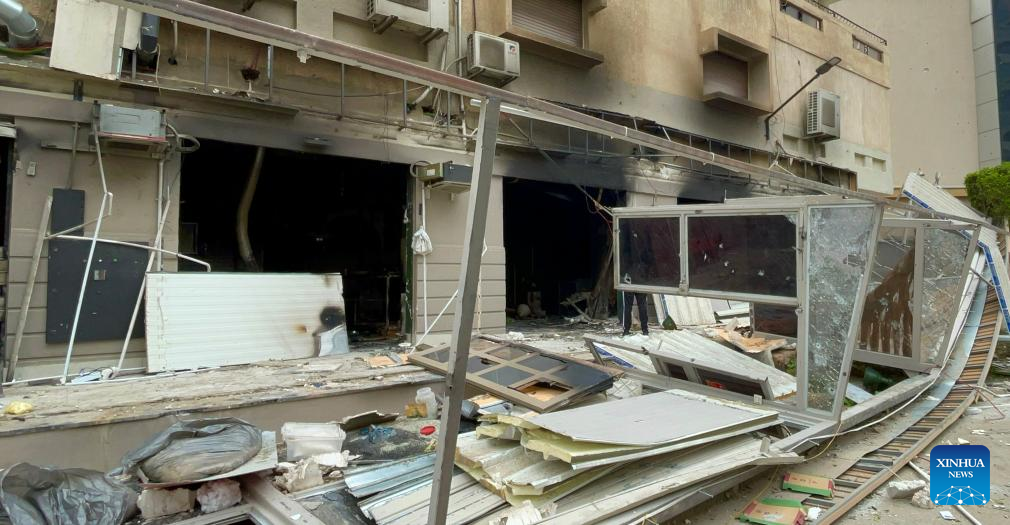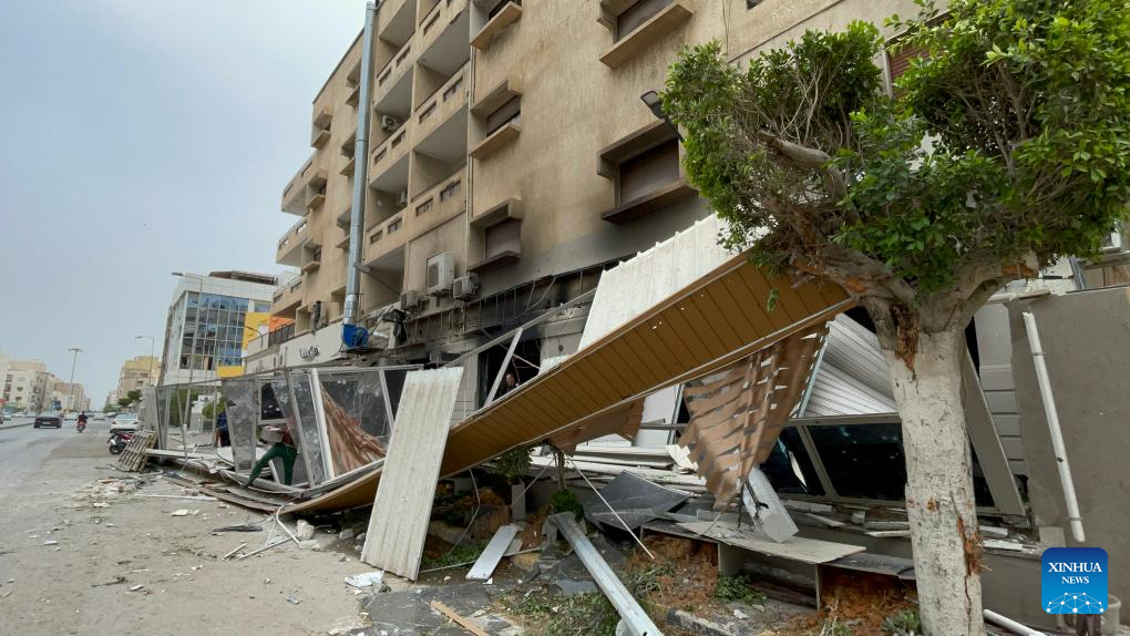 This photo taken on May 14, 2025 shows a building damaged during violent clashes on a street in Tripoli, Libya. Libya's Tripoli-based Government of National Unity (GNU) declared a ceasefire on Wednesday following intense overnight clashes between rival militias that spread into central and residential districts of the capital, prompting international calls to protect civilians and prevent further escalation. (Photo by Hamza Turkia/Xinhua)