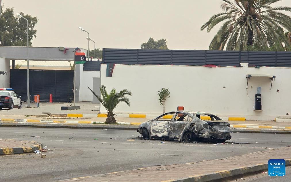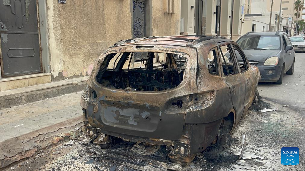 This photo taken on May 14, 2025 shows a car damaged during violent clashes on a street in Tripoli, Libya. Libya's Tripoli-based Government of National Unity (GNU) declared a ceasefire on Wednesday following intense overnight clashes between rival militias that spread into central and residential districts of the capital, prompting international calls to protect civilians and prevent further escalation. (Photo by Hamza Turkia/Xinhua)