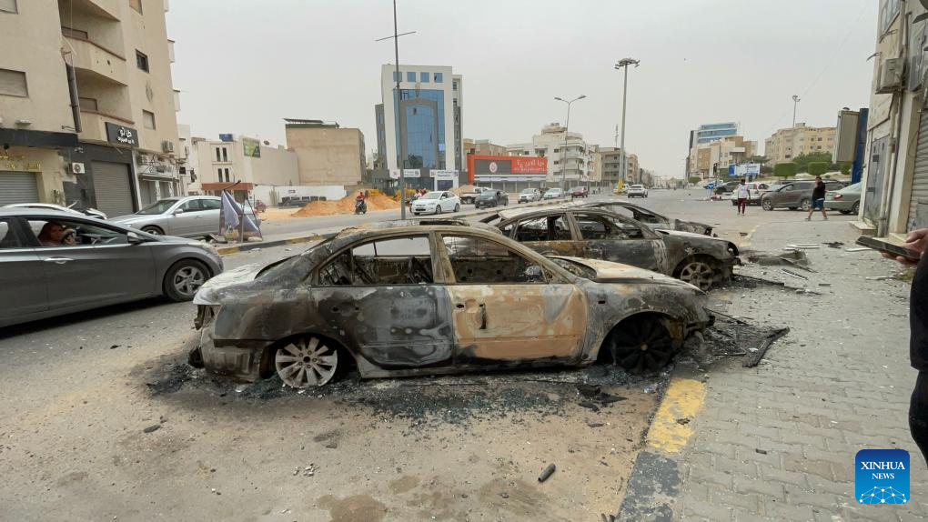 This photo taken on May 14, 2025 shows damaged vehicles during violent clashes on a street in Tripoli, Libya. Libya's Tripoli-based Government of National Unity (GNU) declared a ceasefire on Wednesday following intense overnight clashes between rival militias that spread into central and residential districts of the capital, prompting international calls to protect civilians and prevent further escalation. (Photo by Hamza Turkia/Xinhua)