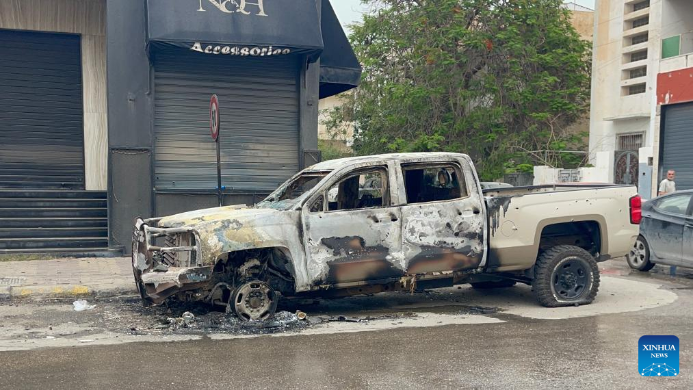 This photo taken on May 14, 2025 shows a pickup damaged during violent clashes on a street in Tripoli, Libya. Libya's Tripoli-based Government of National Unity (GNU) declared a ceasefire on Wednesday following intense overnight clashes between rival militias that spread into central and residential districts of the capital, prompting international calls to protect civilians and prevent further escalation. (Photo by Hamza Turkia/Xinhua)