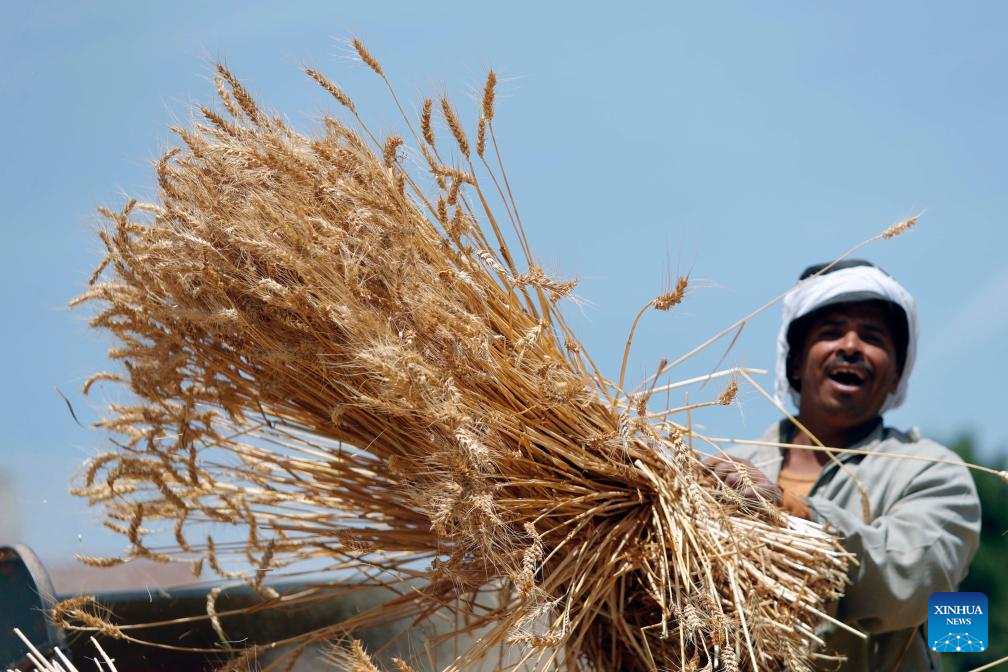 Farmers collect bundled wheat at a field in Qalyubia Governorate, Egypt, on May 17, 2025. The wheat harvest season has begun across Egypt. (Xinhua/Ahmed Gomaa)