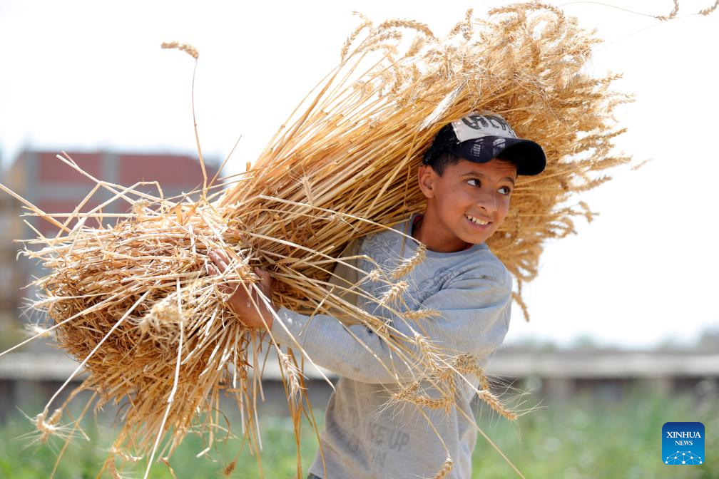 A boy collects bundled wheat at a field in Qalyubia Governorate, Egypt, on May 17, 2025. The wheat harvest season has begun across Egypt. (Xinhua/Ahmed Gomaa)