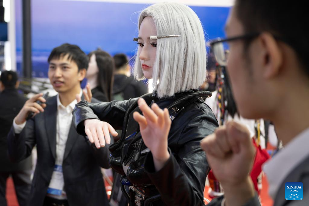 A humanoid robot is pictured at the 34th Harbin International Economic and Trade Fair in Harbin, capital of northeast China's Heilongjiang Province, May 17, 2025. The fair opened here on Saturday, attracting exhibitors from over 110 countries and regions. (Xinhua/Zhang Tao)