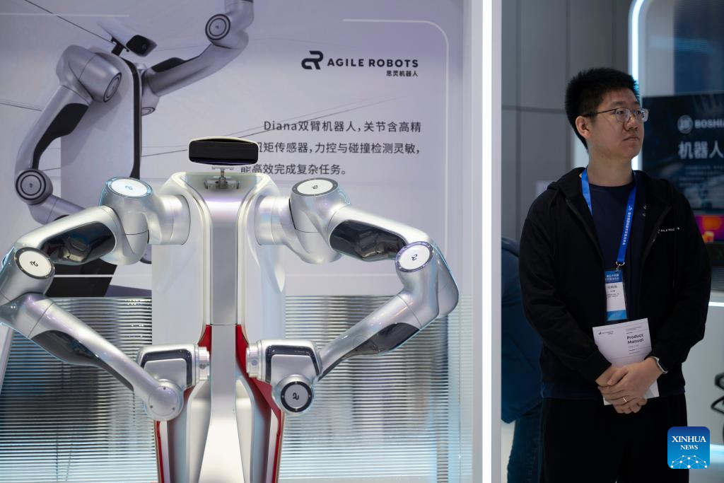 Visitors look at smart robotic arms at the 34th Harbin International Economic and Trade Fair in Harbin, capital of northeast China's Heilongjiang Province, May 17, 2025. The fair opened here on Saturday, attracting exhibitors from over 110 countries and regions. (Xinhua/Wang Jianwei)
