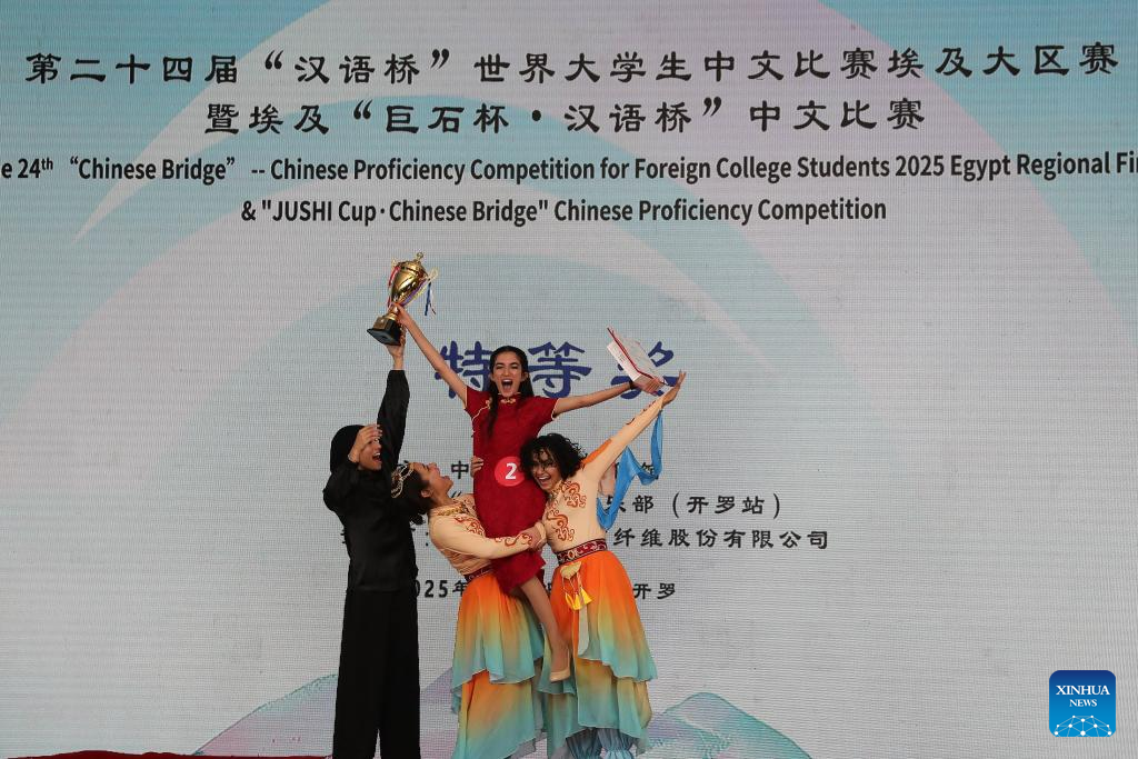 Ola Sherief (2nd R), a student from Cairo University, celebrates with friends after winning the grand prize in the 24th "Chinese Bridge" Chinese proficiency competition for Egyptian university students in Cairo, Egypt, May 17, 2025.