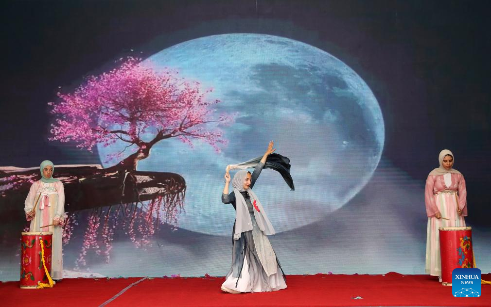Contestants present a talent show during the 24th "Chinese Bridge" Chinese proficiency competition for Egyptian university students in Cairo, Egypt, May 17, 2025.