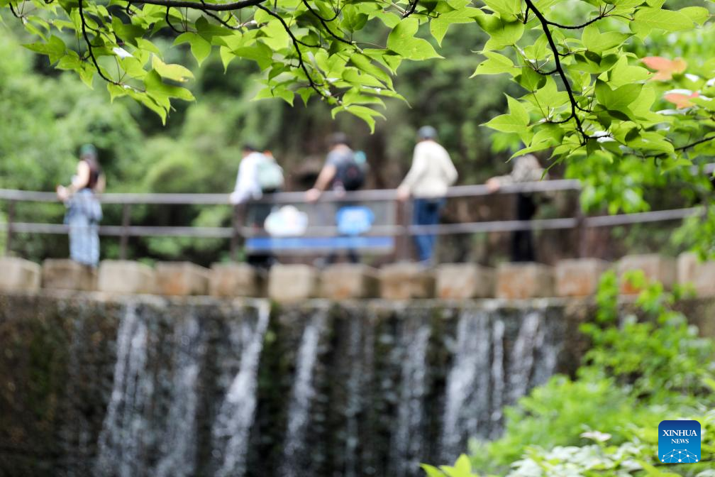 Tourists enjoy themselves at a national forest park at Tonglu County in Hangzhou, east China's Zhejiang Province, May 19, 2025. This year's May 19 marks the 15th China Tourism Day. (Photo by Xu Junyong/Xinhua)
