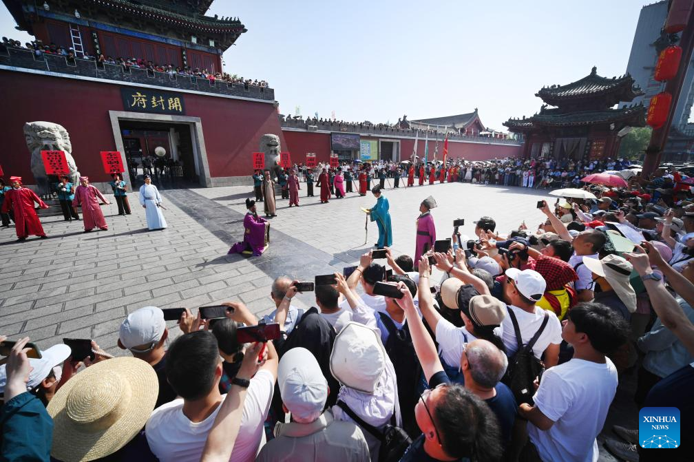 People watch a folk performance at a scenic spot in Kaifeng City, central China's Henan Province, May 19, 2025. This year's May 19 marks the 15th China Tourism Day. (Photo by Li Junsheng/Xinhua)