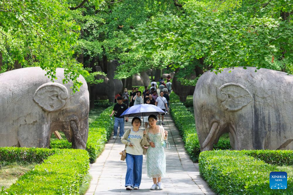 People visit the imperial Xiaoling Mausoleum, the burial site of the Ming Dynasty's (1368-1644) founding emperor Zhu Yuanzhang, in Nanjing, east China's Jiangsu Province, May 19, 2025. This year's May 19 marks the 15th China Tourism Day. (Photo by Su Yang/Xinhua)