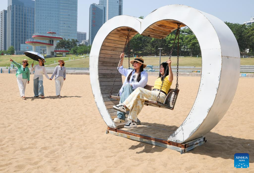 Tourists enjoy themselves at a park in Lianyungang, east China's Jiangsu Province, May 19, 2025. This year's May 19 marks the 15th China Tourism Day. (Photo by Wang Jianmin/Xinhua)
