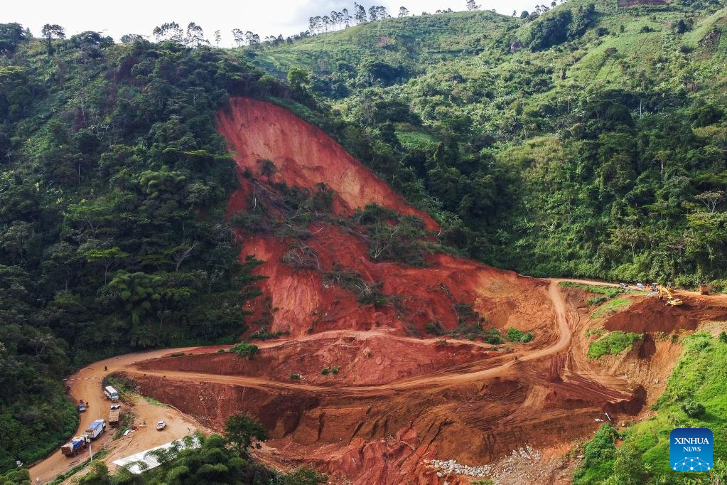 An aerial drone photo taken on April 22, 2025 shows the construction site of the Dschang cliff road near the town of Dschang in the West Region of Cameroon.(Xinhua/Kepseu)