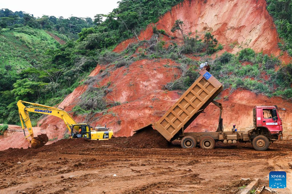 This photo taken on April 22, 2025 shows engineering vehicles operating at the construction site of the Dschang cliff road near the town of Dschang in the West Region of Cameroon.(Xinhua/Kepseu)
