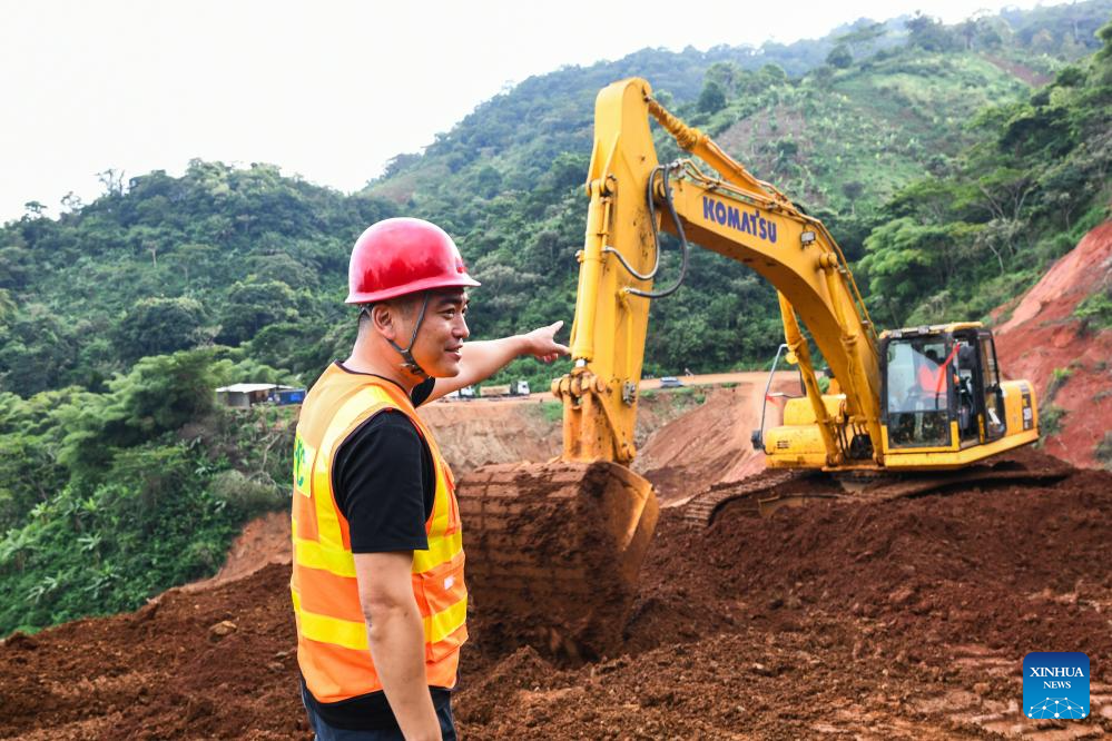 A managerial staff member of China First Highway Engineering Co., Ltd. (CFHEC) works at the construction site of the Dschang cliff road near the town of Dschang in the West Region of Cameroon, April 22, 2025.(Xinhua/Kepseu)