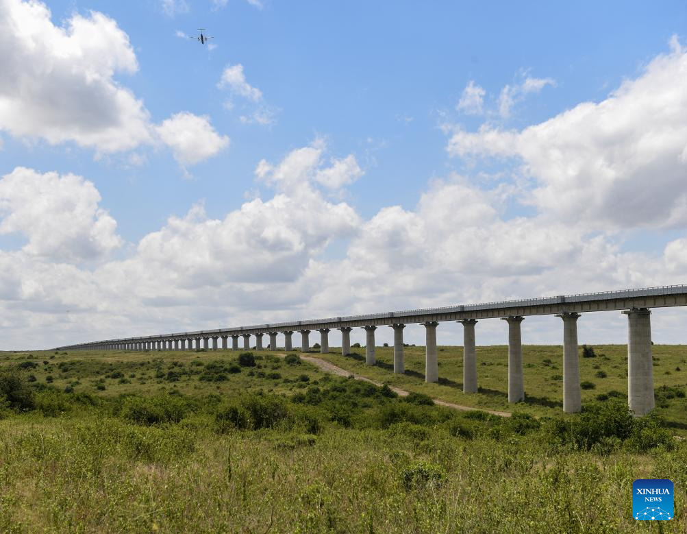 Photo taken on May 16, 2025 shows a viaduct of the Nairobi-Malaba Standard Gauge Railway traversing Nairobi National Park in Kenya. Constructed by China Road and Bridge Corporation (CRBC), the Nairobi-Malaba Standard Gauge Railway is a key component of the Kenya Standard Gauge Railway Project with a total length of about 960 km upon completion. According to Yu Fujia, assistant general manager of CRBC's Kenya operations, the Nairobi-Malaba railway incorporates 14 ground-level wildlife crossings, 150 underground culverts, and six km of noise-dampening overpasses with light-permeable barriers, forming a three-dimensional corridor for animals. (Xinhua/Li Yahui)