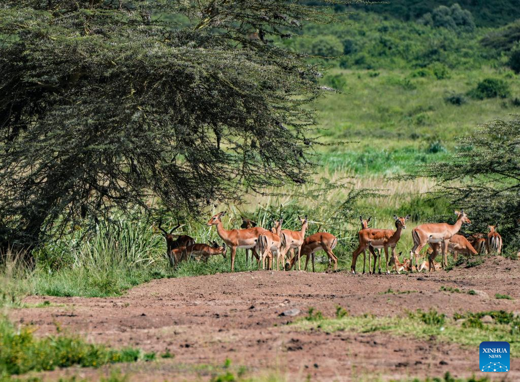 Antelopes are seen in Nairobi National Park, Kenya, on May 16, 2025. Constructed by China Road and Bridge Corporation (CRBC), the Nairobi-Malaba Standard Gauge Railway is a key component of the Kenya Standard Gauge Railway Project with a total length of about 960 km upon completion. According to Yu Fujia, assistant general manager of CRBC's Kenya operations, the Nairobi-Malaba railway incorporates 14 ground-level wildlife crossings, 150 underground culverts, and six km of noise-dampening overpasses with light-permeable barriers, forming a three-dimensional corridor for animals. (Xinhua/Li Yahui)