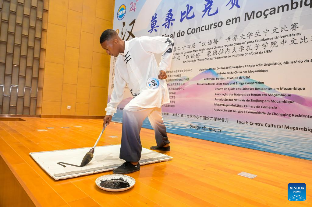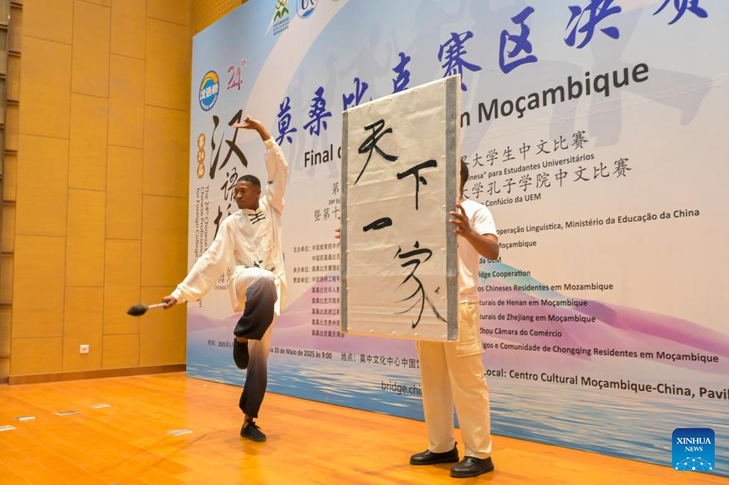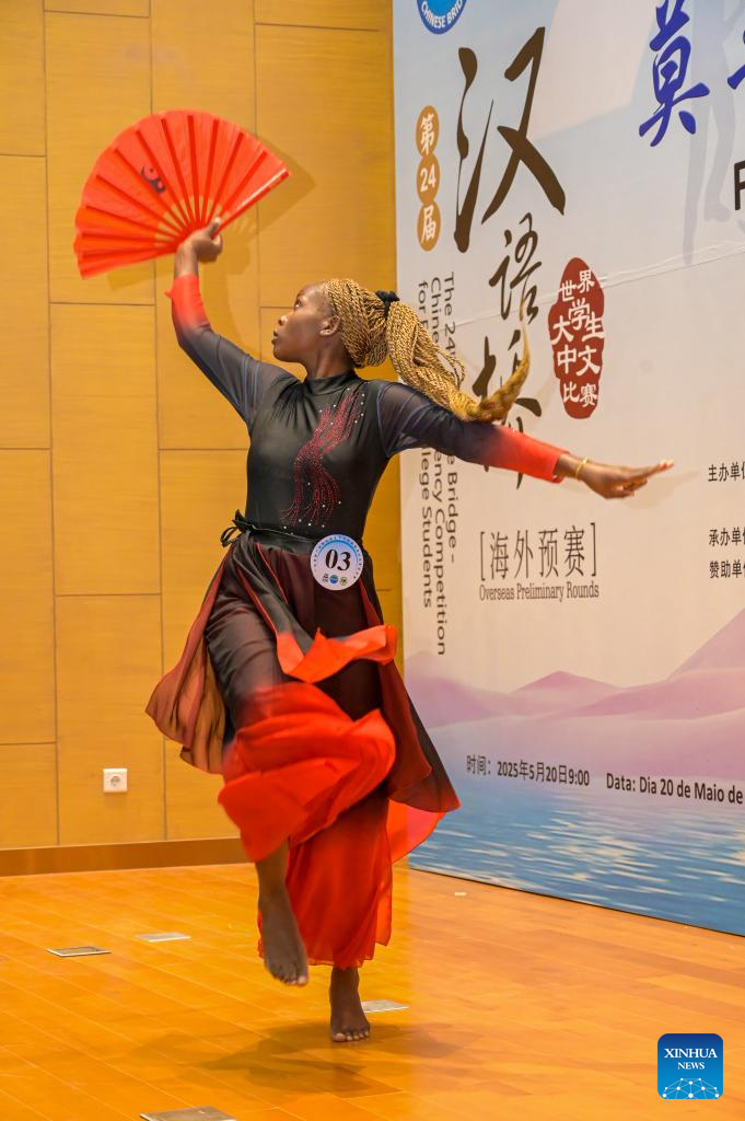 A contestant performs in the 24th "Chinese Bridge" Chinese Proficiency Competition for Foreign College Students in Maputo, capital city of Mozambique, May 20, 2025. The Mozambican division final round of the 24th "Chinese Bridge" Chinese Proficiency Competition for Foreign College Students was held at the Mozambique-China Cultural Center, in Maputo, capital city of Mozambique on Tuesday. (Photo by Mendes Mondlane/Xinhua)