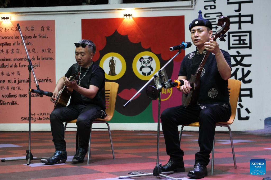 Members of the Nair Band perform in the Chinese Cultural Center of Benin, in Cotonou, Benin, May 20, 2025. A concert titled "Heavenly Melody: Echoes from the Grasslands", featuring artists from north China's Inner Mongolia Autonomous Region, was held at the Chinese Cultural Center of Benin, in Cotonou, on Tuesday night. (Photo by Seraphin Zounyekpe/Xinhua)
