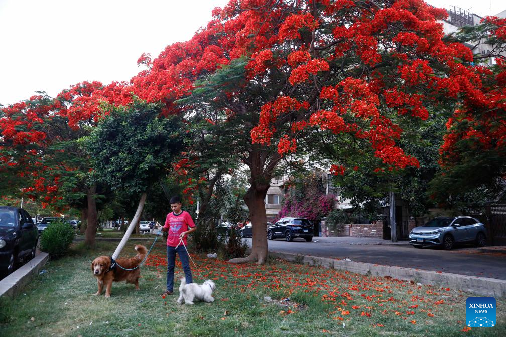 A boy walks dogs under blooming royal poinciana trees on a street in Cairo, Egypt, on May 22, 2025. (Xinhua/Ahmed Gomaa)