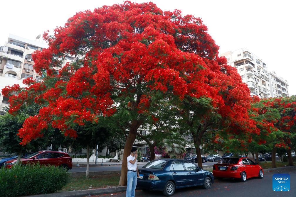 This photo taken on May 22, 2025 shows blooming royal poinciana trees on a street in Cairo, Egypt. (Xinhua/Ahmed Gomaa)