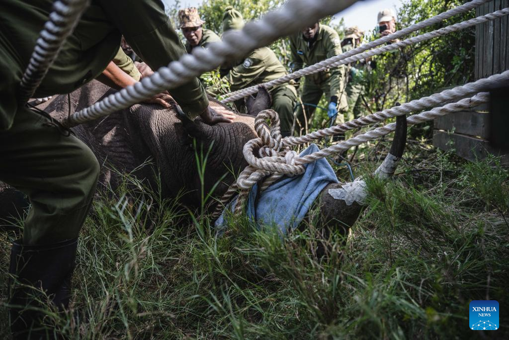 Members of the Kenya Wildlife Service (KWS) move a tranquilized black rhino during a translocation exercise at Ol Pejeta Conservancy in Laikipia, Kenya, on May 24, 2025. (Xinhua/Wang Guansen)