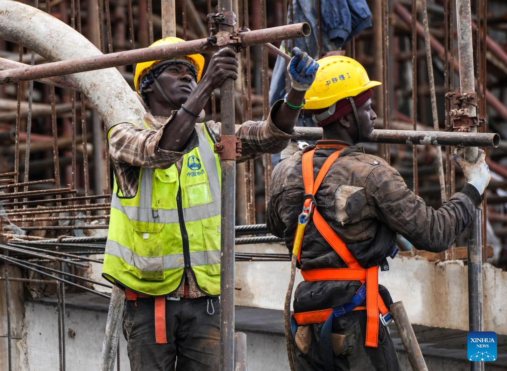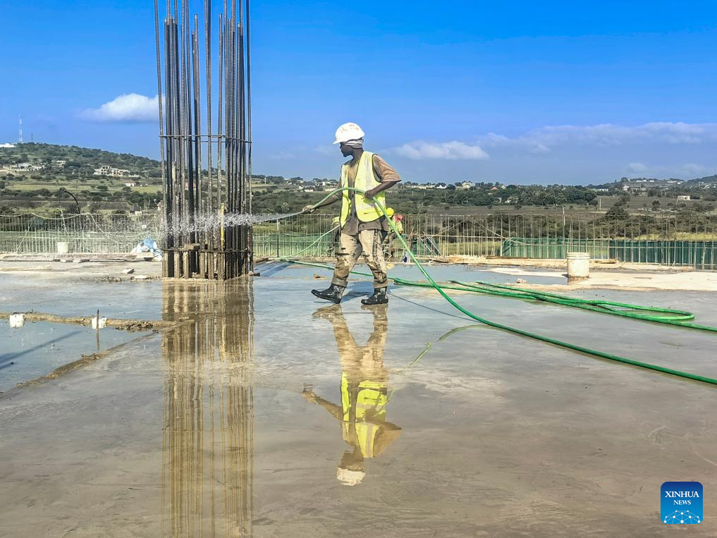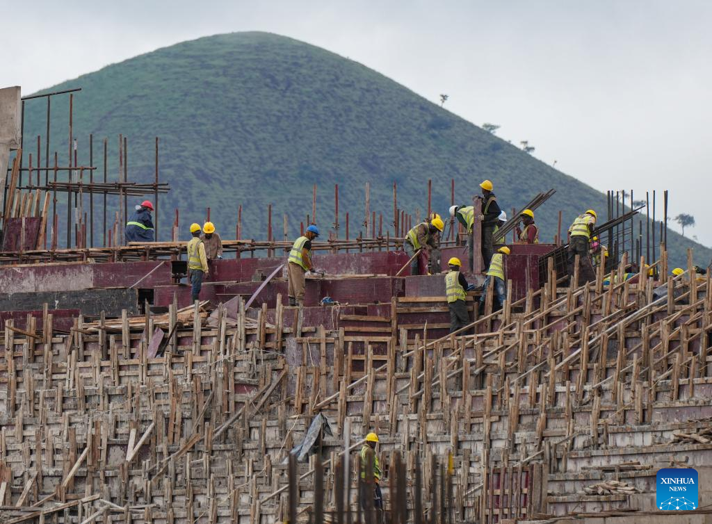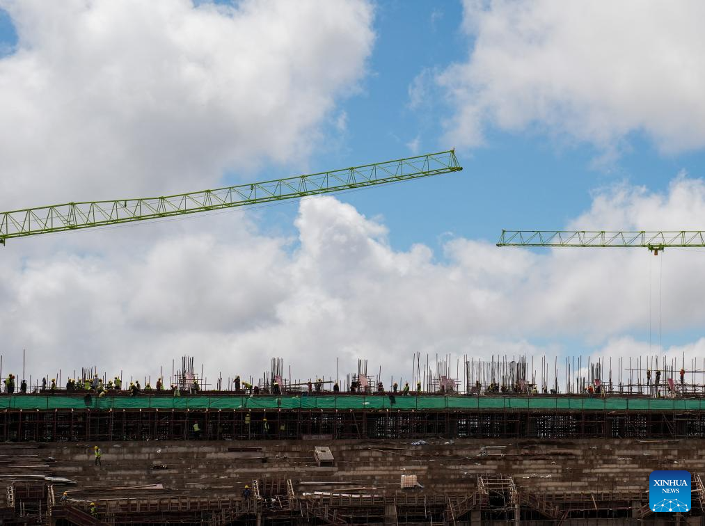 People work at a comprehensive sports stadium under construction by China Railway Construction Engineering Group (CRCEG) in Arusha, Tanzania, on April 25, 2025. Set to become one of the venues for the 2027 Africa Cup of Nations (AFCON), the stadium is more than just a sports facility; it is a symbol of Tanzania's commitment to hosting major international events. (Xinhua/Li Yahui)