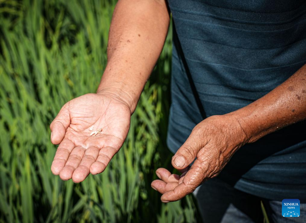 Chinese agronomist Hu Yuefang checks the rice seeds at the China Hybrid Rice High-Yield Demonstration Base near Antananarivo, Madagascar, March 26, 2025. (Xinhua/Li Yahui)