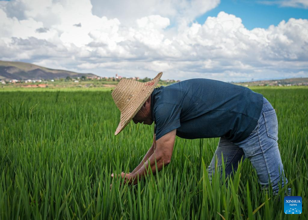 ANTANANARIVO, June 5 (Xinhua) -- As usual, 67-year-old Chinese agronomist Hu Yuefang started his day at dawn, donning a wide-brimmed hat and draping a towel over his shoulders. Barefooted and with trousers rolled up, he waded into the muddy paddies, inspecting the crop alongside local farmers.