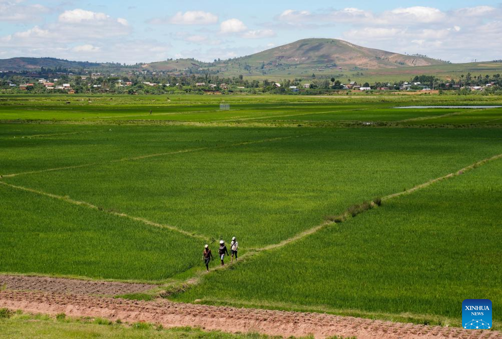 Farmers walk among fields of the China Hybrid Rice High-Yield Demonstration Base near Antananarivo, Madagascar, March 26, 2025. (Xinhua/Li Yahui)