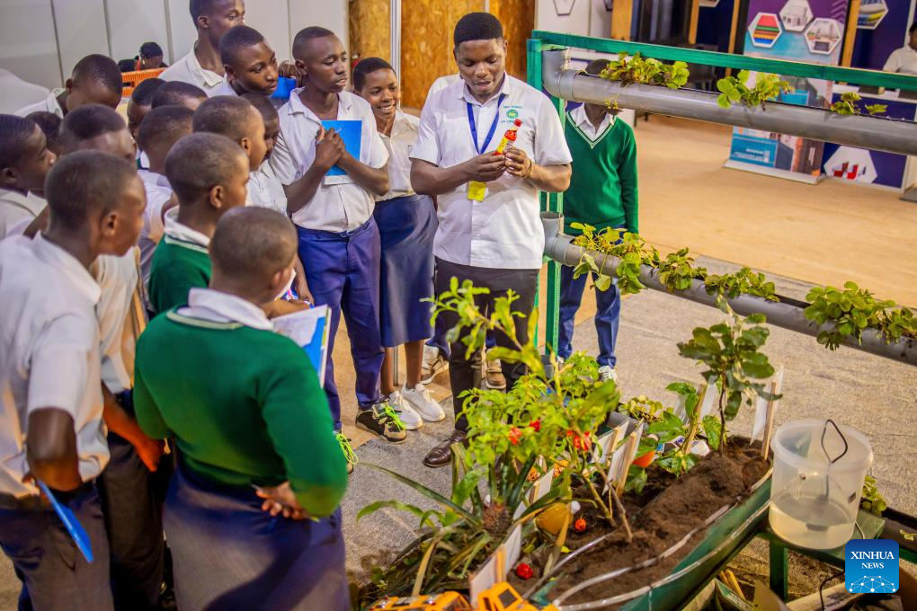 Students learn about the production process of a chili product during the Technical and Vocational Education and Training (TVET) Expo in Kigali, Rwanda, on June 5, 2025. (Photo by Cyril Ndegeya/Xinhua)