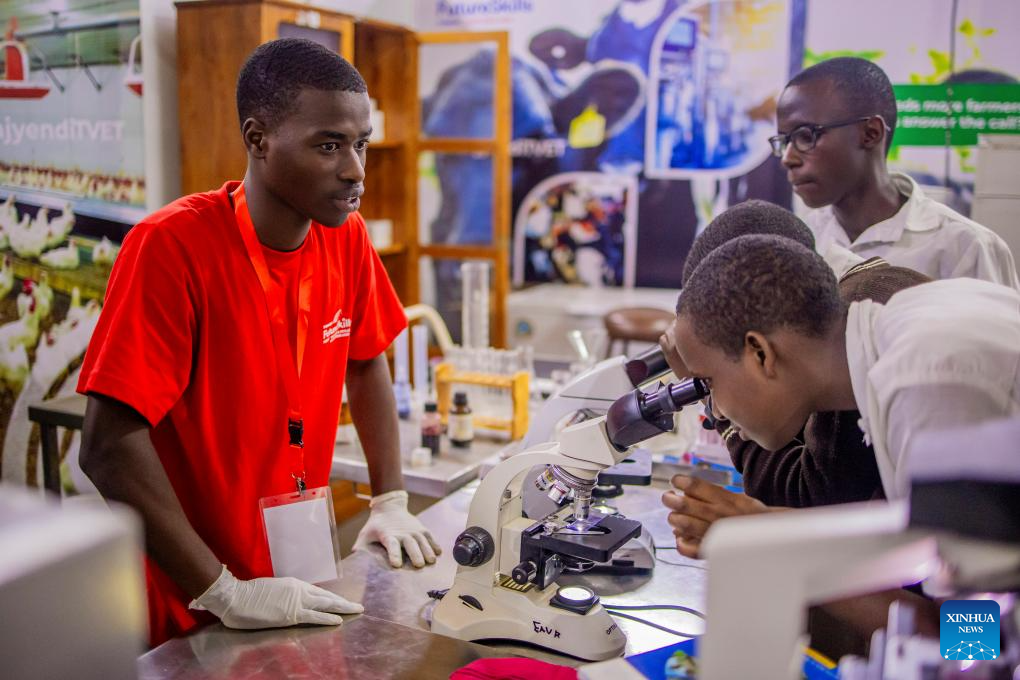 Students try to use microscopes during the Technical and Vocational Education and Training (TVET) Expo in Kigali, Rwanda, on June 5, 2025. (Photo by Cyril Ndegeya/Xinhua)