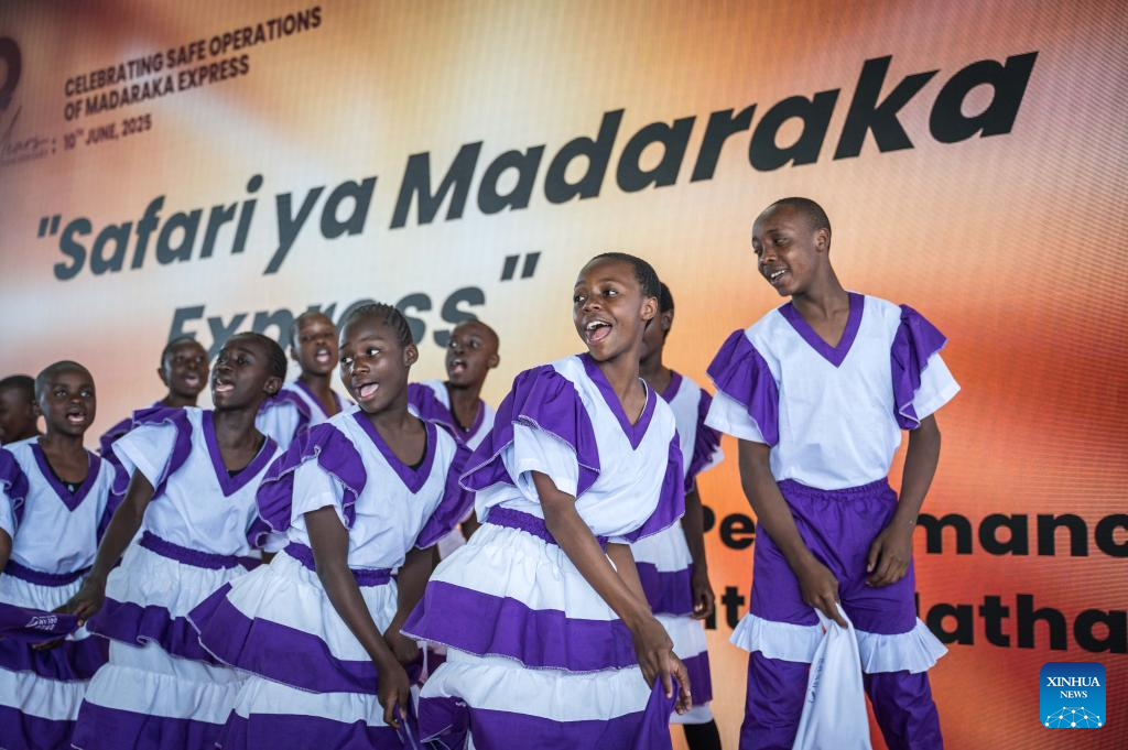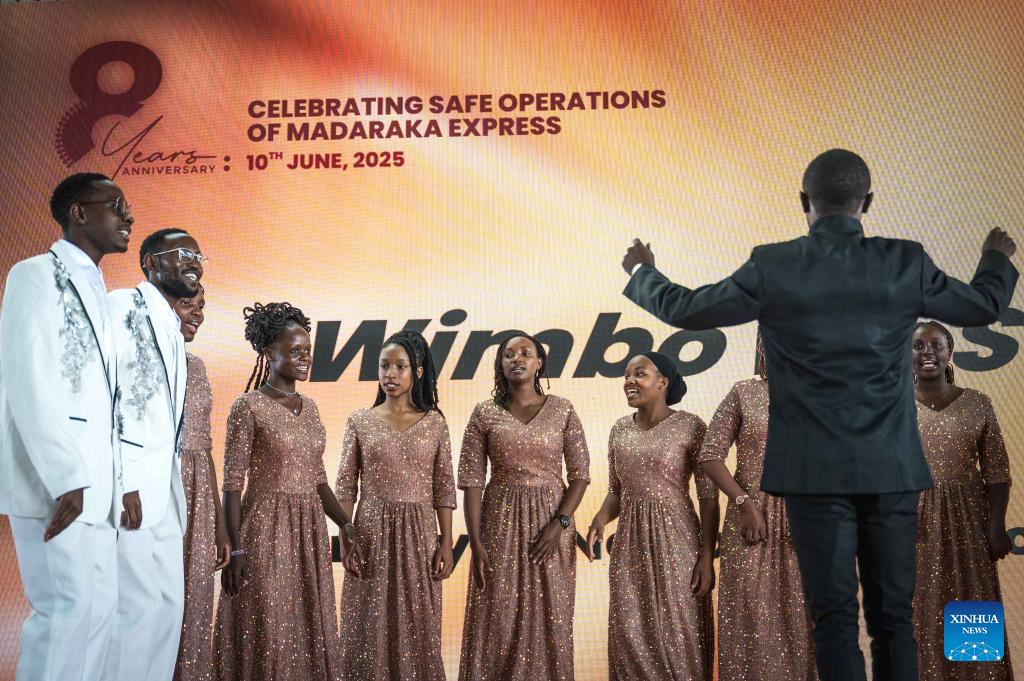 Students of the University of Nairobi perform during a celebration to mark eight years of seamless operation of the Chinese-built Mombasa-Nairobi Standard Gauge Railway (SGR) in Kenya in Nairobi, Kenya, June 10, 2025. (Xinhua/Wang Guansen)