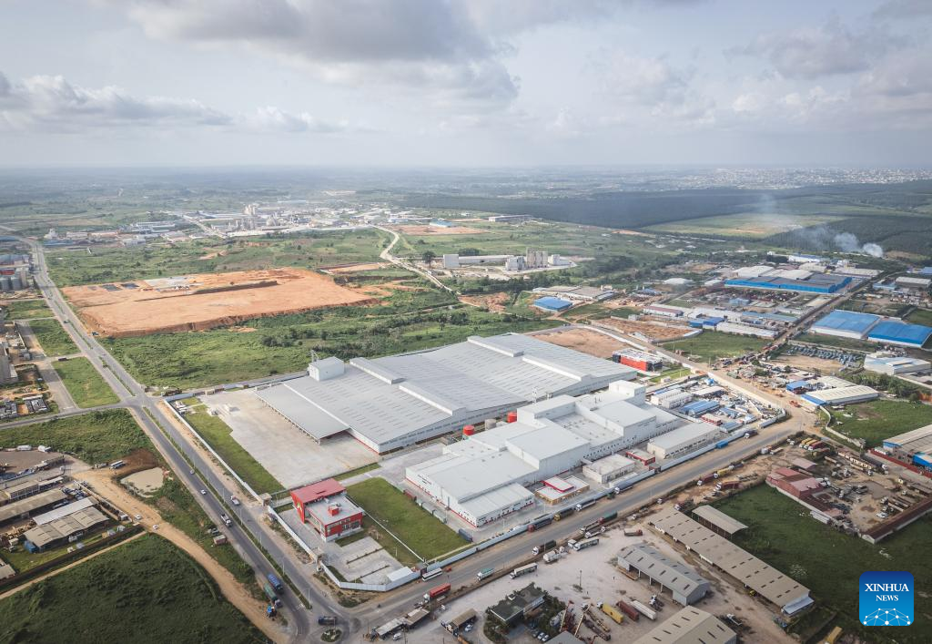 An aerial drone photo taken on May 27, 2025 shows the cocoa processing complex at the PK24 Industrial Park on the northwestern outskirts of Abidjan, Cote d'Ivoire. (Xinhua/Wang Guansen)